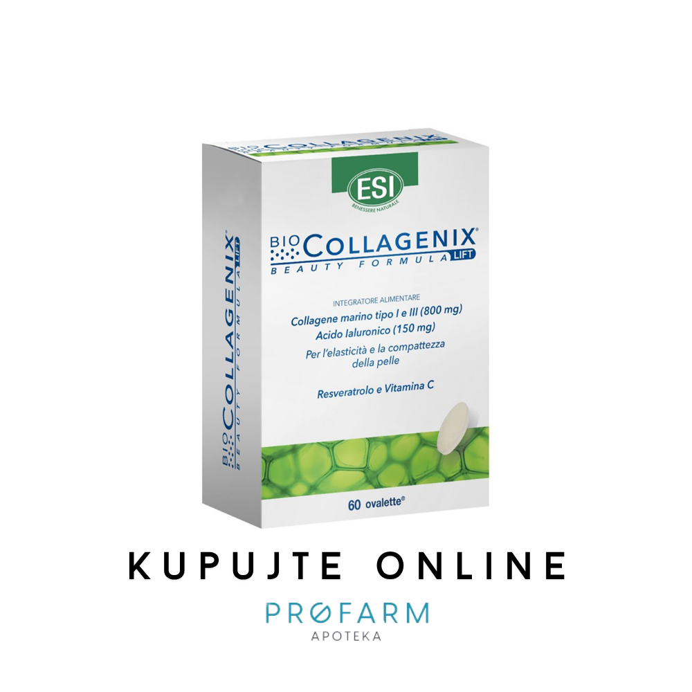 ESI Collagenix Lift 60 comp je dodatak ishrani koji potiče čvrstoću i elastičnost kože. Njegova formula kombinuje morski kolagen tipa I i III, hijaluronsku kiselinu, resveratrol i vitamin C, koji pomažu odgoditi starenje kože. Sniženje pred istek roka – jul 2026.